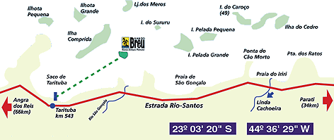 Partindo de São Paulo : Rodovia dos Trabalhadores / Rodovia Ayrton Senha / Via Dutra em Taubaté saída 110.7 Km p/ estrada Osvaldo Cruz( direção à Ubatuba)/ Rio Santos ( Km 543)- Tarituba ( 34 Km após Parati ), onde se faz o embarque para a Ilha do Breuu. Partindo do Rio de Janeiro : Rodovia Barra da Tijuca / Recreio dos Bandeirantes / Rio Santos até o Km 543- Tarituba. Ao chegar vá de carro até o cais para descarregar as malas no nosso barco Ilha do Breuu , nosso marinheiro indicará o estacionamento (cooperado), ele é o único murado.